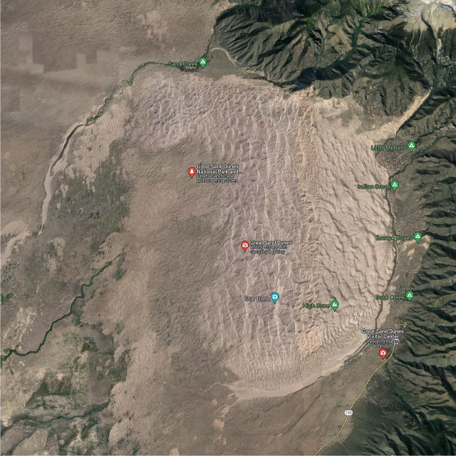 The amount of sand in these dunes is staggering; about 6.5 billion cubic meters, or 1.5 cubic miles in volume. Imagine a giant tunnel-boring machine that could carve out a tunnel about 42 meters (140 feet) in diameter. If such a machine could turn all the rock it encountered into sand, and were to deposit that sand into one big pile the size of the Sand Dunes, then that huge tunnel could span the entire continental United States from coast to coast. That's a lot of sand!