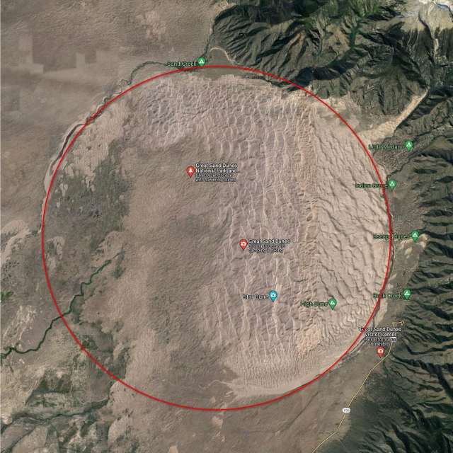 Take a look at how nearly perfectly circular the Sand Dunes pile of sand is, or was at one time, before about a third of it perhaps eroded away along the southwest edges...