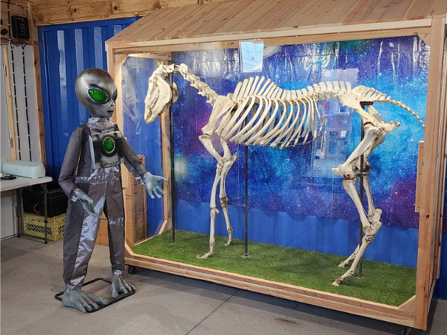 One of the more well known animal mutilations happened in September of 1967, when a horse named Lady (more commonly referred to as "Snippy") turned up dead under very mysterious circumstances. This happened a few miles south of the UFO Watchtower on the Harry King Ranch. There was no blood on the ground, or in the horse, and all tissue, including brain matter, had been removed from the bleached white, bare skeletal remains from the shoulders up. The rest of the body was apparently untouched. The skeleton of this famous horse is on display today at the UFO Watchtower, and it can be seen in documentary episodes such as Ancient Aliens.