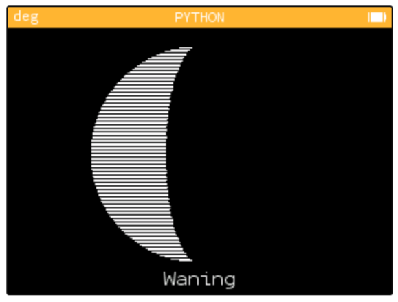 My passion is to share Python code for everyone, and here's where I can go off on a short tangent to share a short program that tells you the phase of the Moon for any date between the years 1582 to 4000. Input a date and the program first calculates its Julian Day number, then uses that to calculate a reasonably accurate phase of the Moon. This script is presented in my book "Python for Numworks", but it runs great in any version of Python.