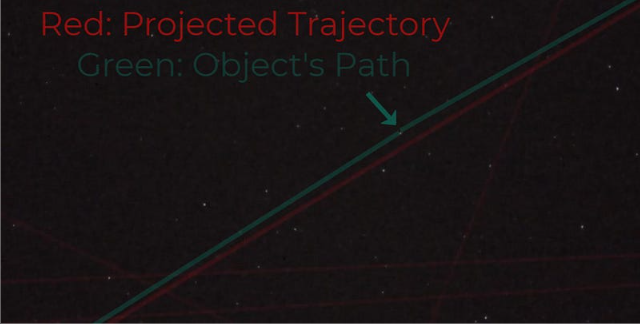 As shown above ( you can watch the full video analysis here ), this "satellite" moved off its line a significant amount. We calculated its orbital altitude at about 625 miles, so its deviation from a straight-line path worked out to about 6 miles during the 2 minutes it was in the field of view of the camera.
