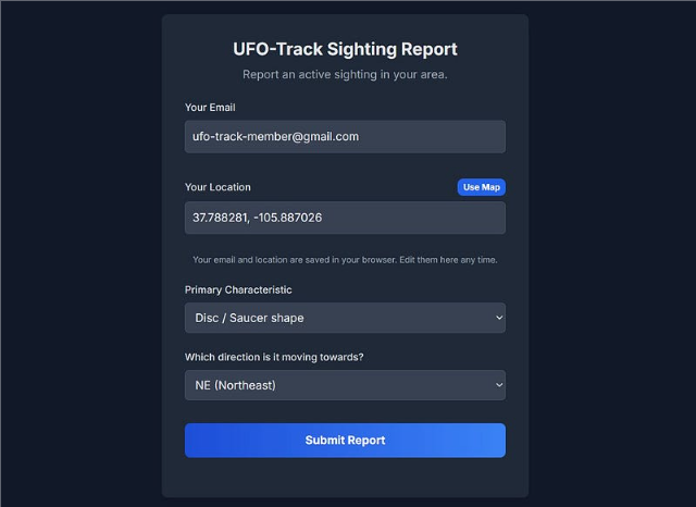 - Member Sighting Reports: Any UFO-Track member can submit a sighting through a quick online form on the UFO-Track website, instantly triggering the alert system. https://report.ufo-track.com